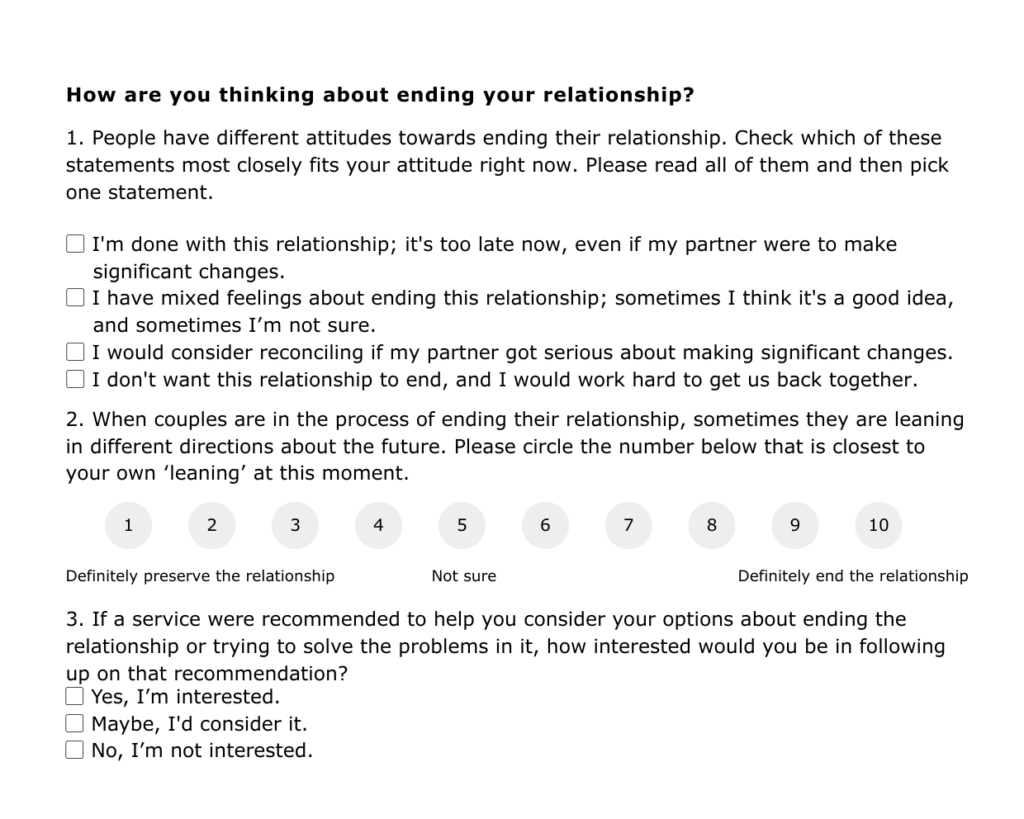 Figure 1. Divorce and separation ambivalence intake questions. (adapted from Doherty, Harris and Didericksen’s self-assessment.)